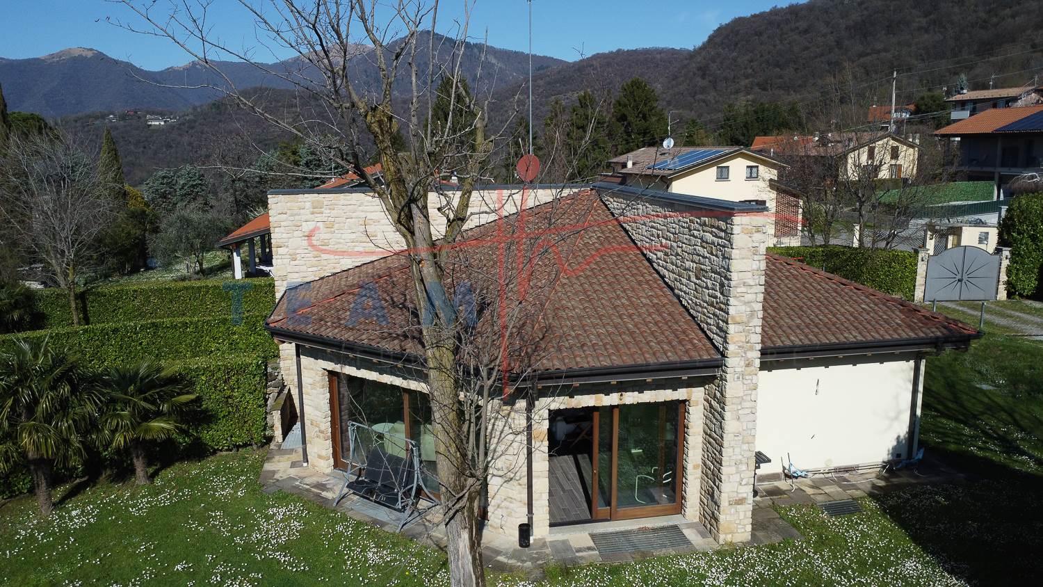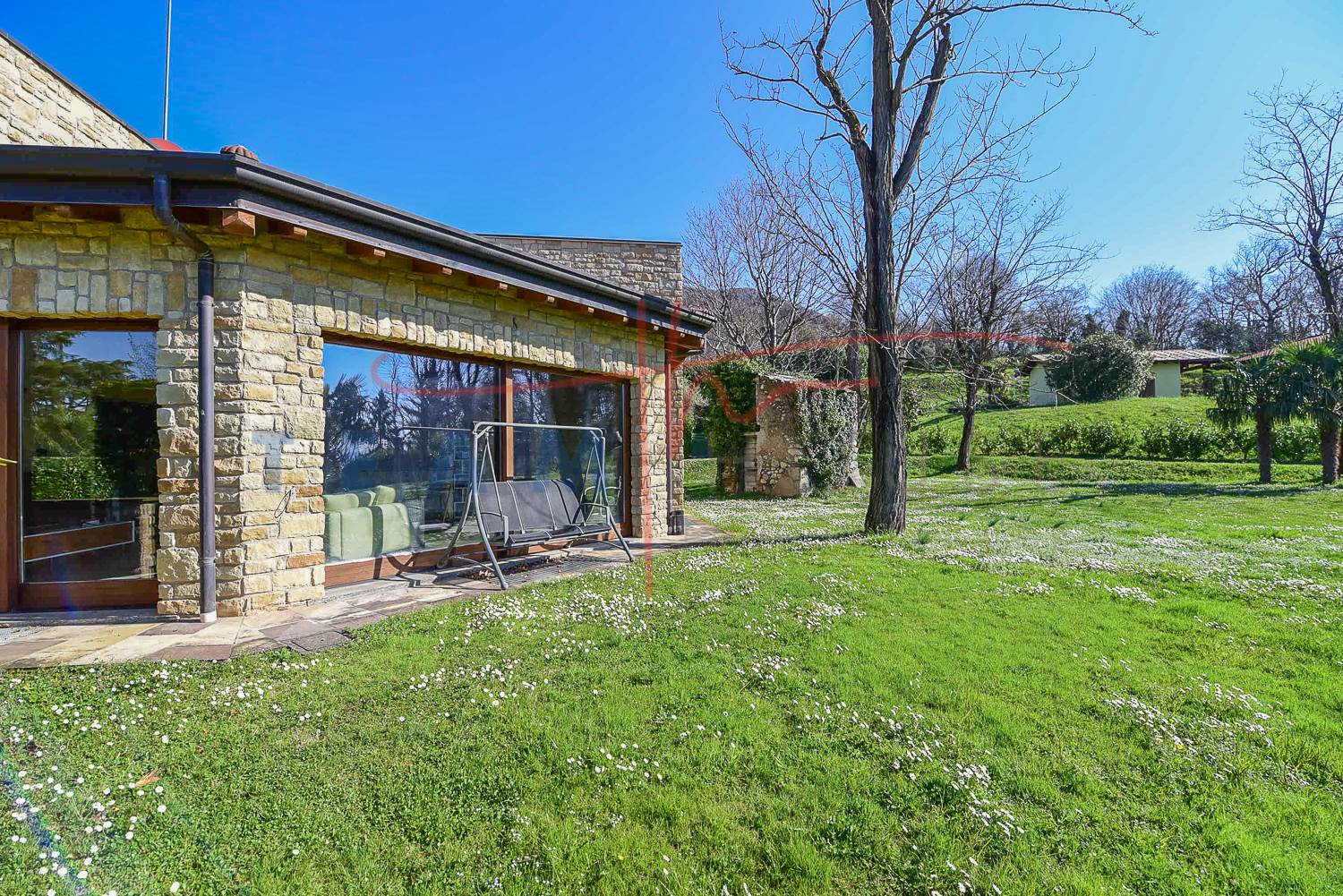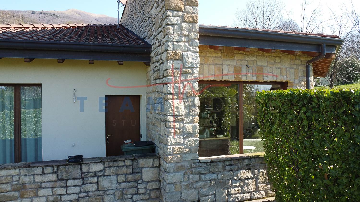 La proprietà colpisce immediatamente per il suo design distintivo. La facciata alterna sapientemente l'intonaco chiaro a imponenti inserti in pietra a vista, che donano alla struttura un aspetto solido ed elegante. Il tetto a falde con coppi tradizionali si sposa con linee geometriche contemporanee, creando un contrasto armonico che si inserisce perfettamente nel paesaggio collinare circostante.