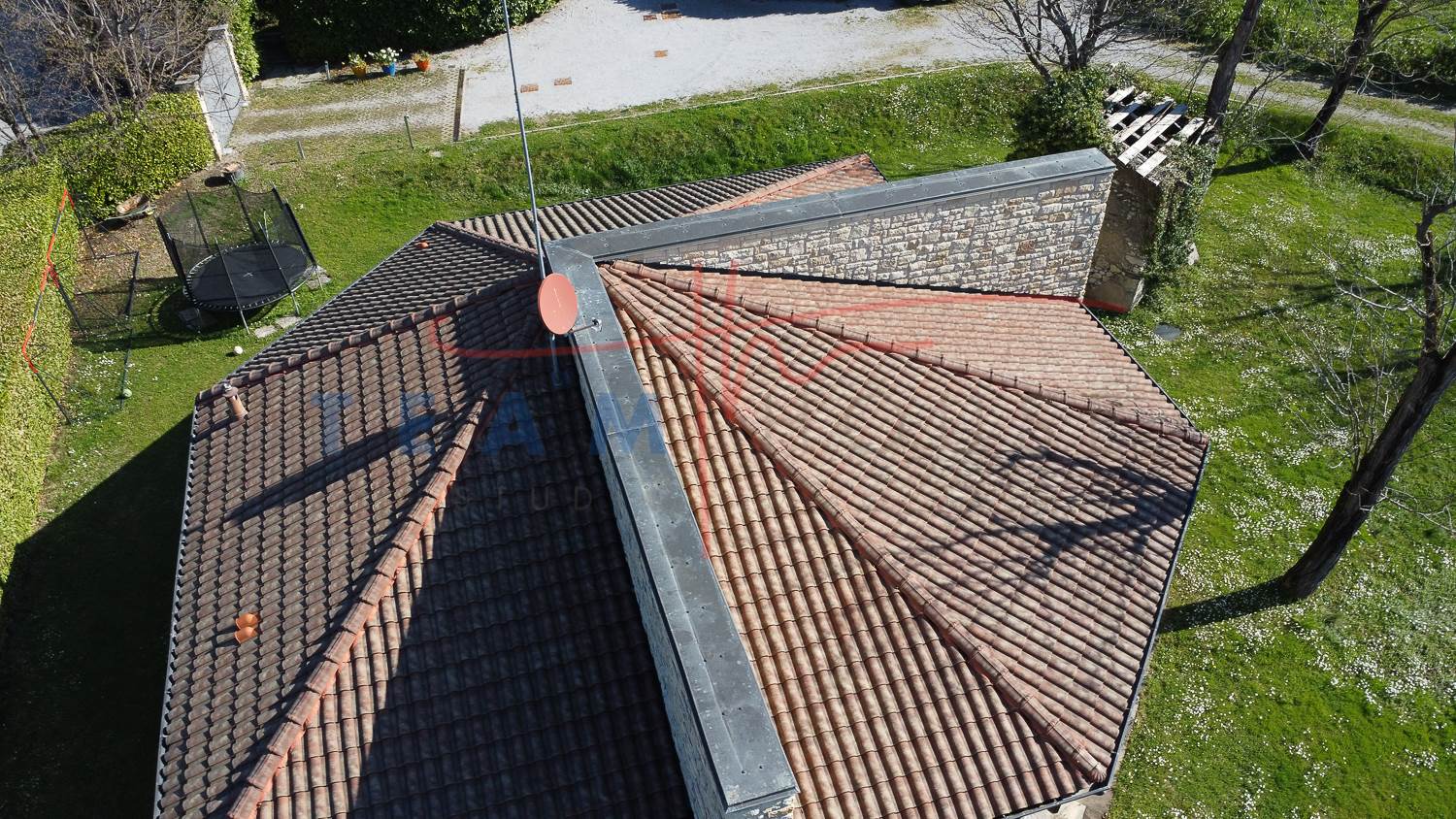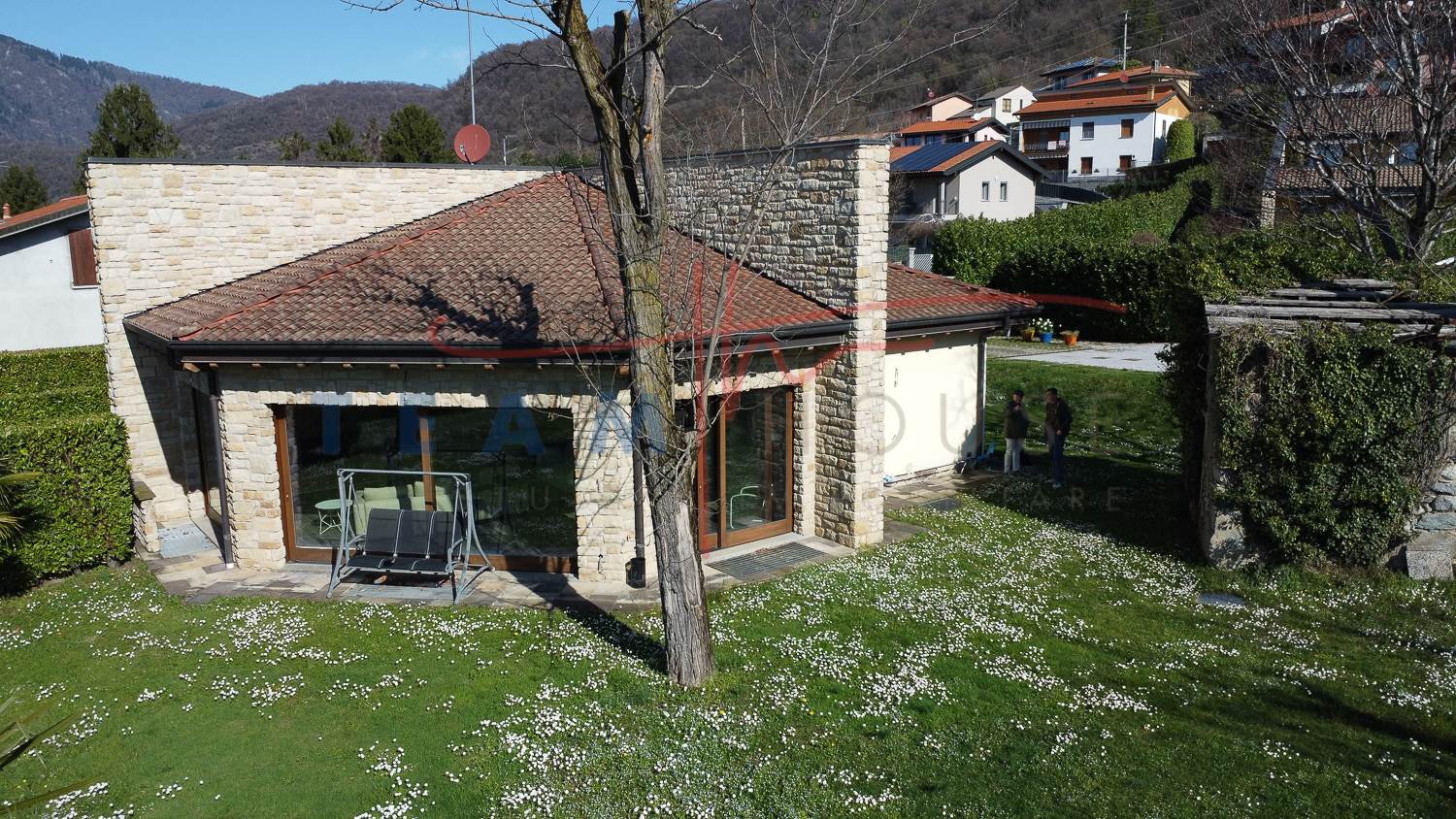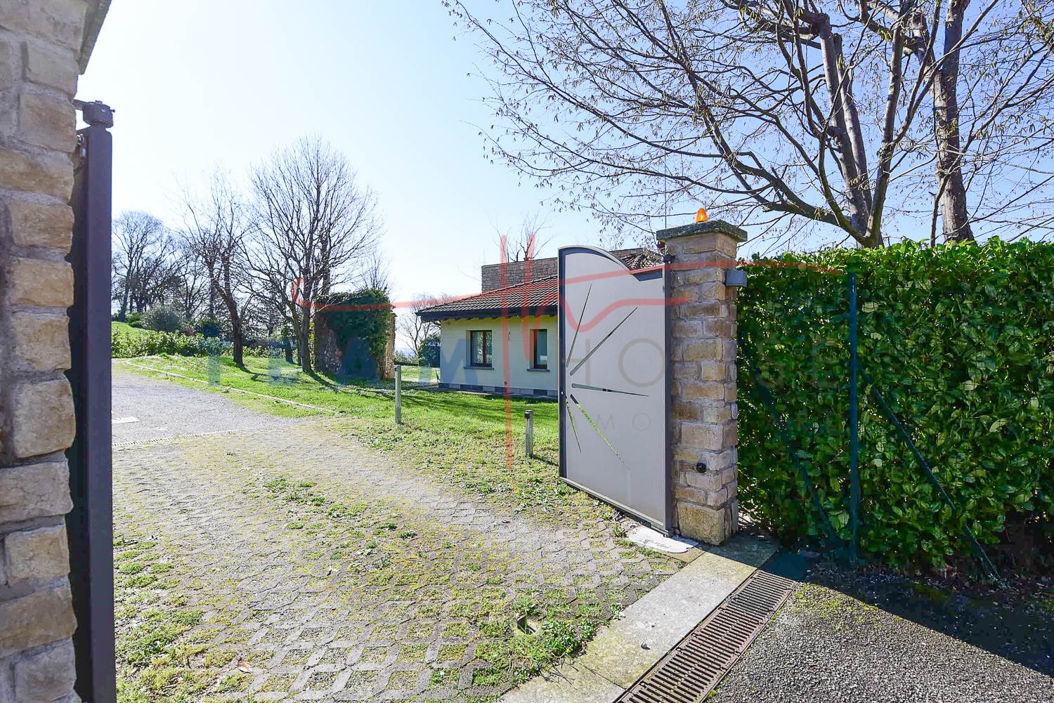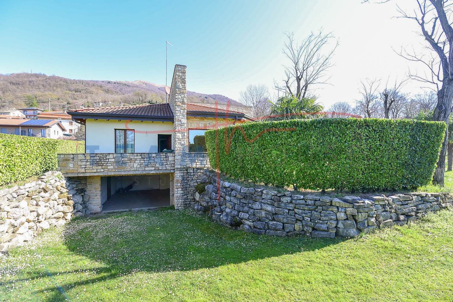 La proprietà colpisce immediatamente per il suo design distintivo. La facciata alterna sapientemente l'intonaco chiaro a imponenti inserti in pietra a vista, che donano alla struttura un aspetto solido ed elegante. Il tetto a falde con coppi tradizionali si sposa con linee geometriche contemporanee, creando un contrasto armonico che si inserisce perfettamente nel paesaggio collinare circostante.