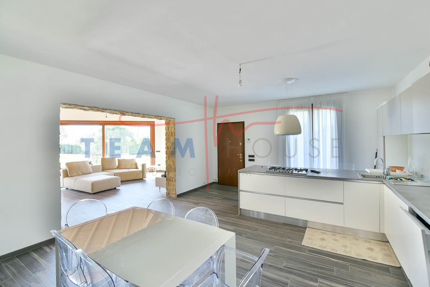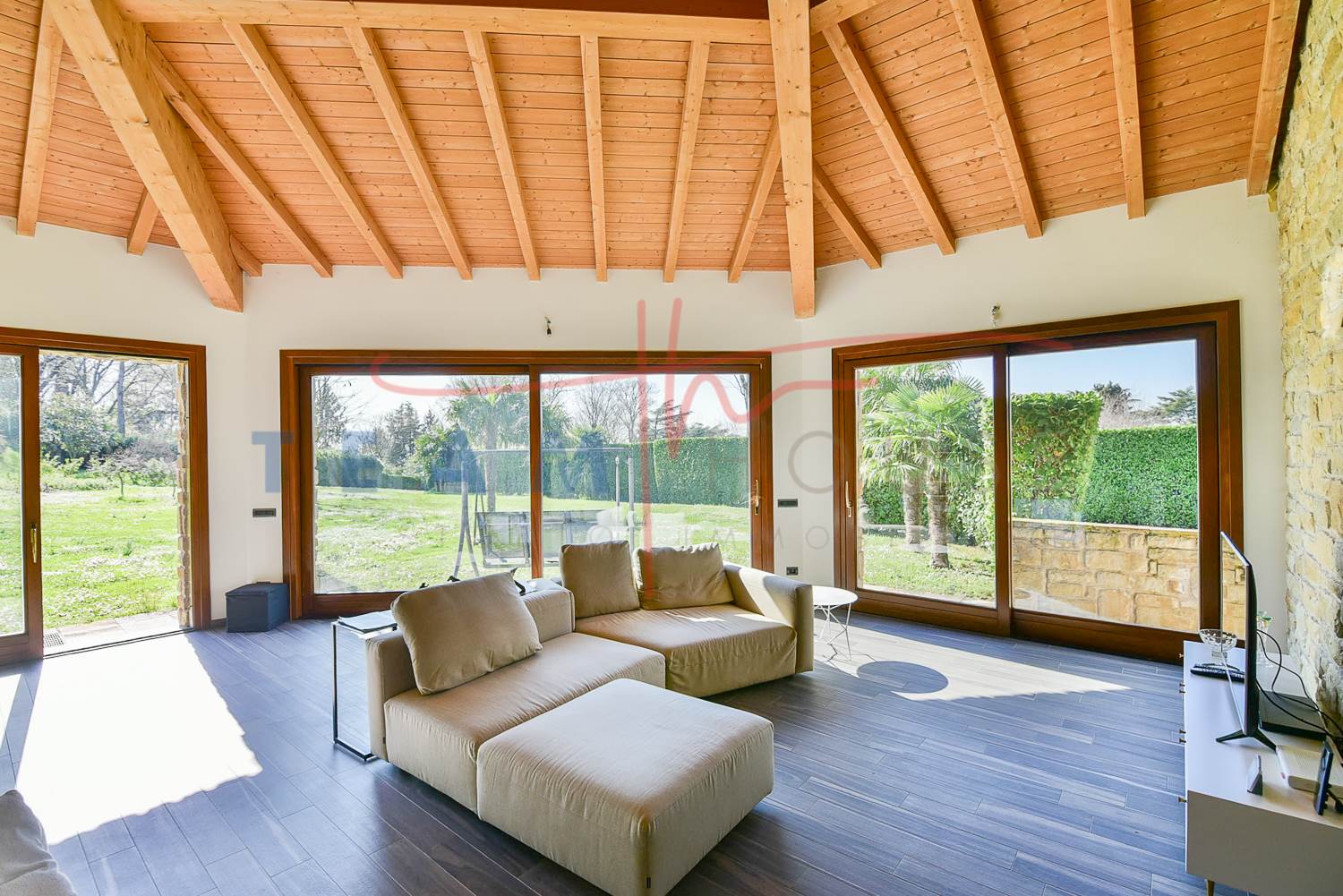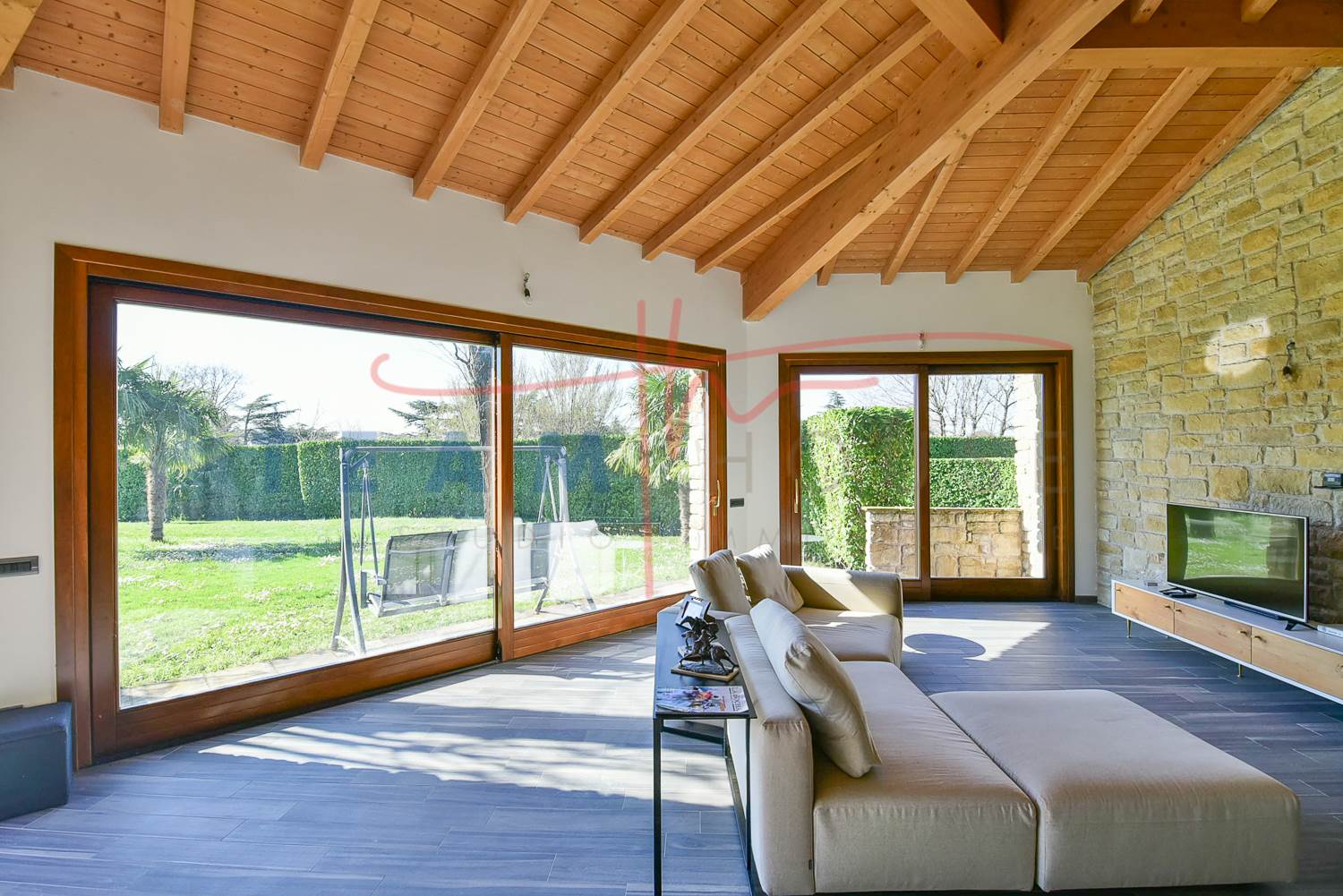 Zona Giorno: Grandi vetrate scorrevoli collegano direttamente il salone al giardino, abbattendo i confini tra interno ed esterno e garantendo una luminosità naturale straordinaria.