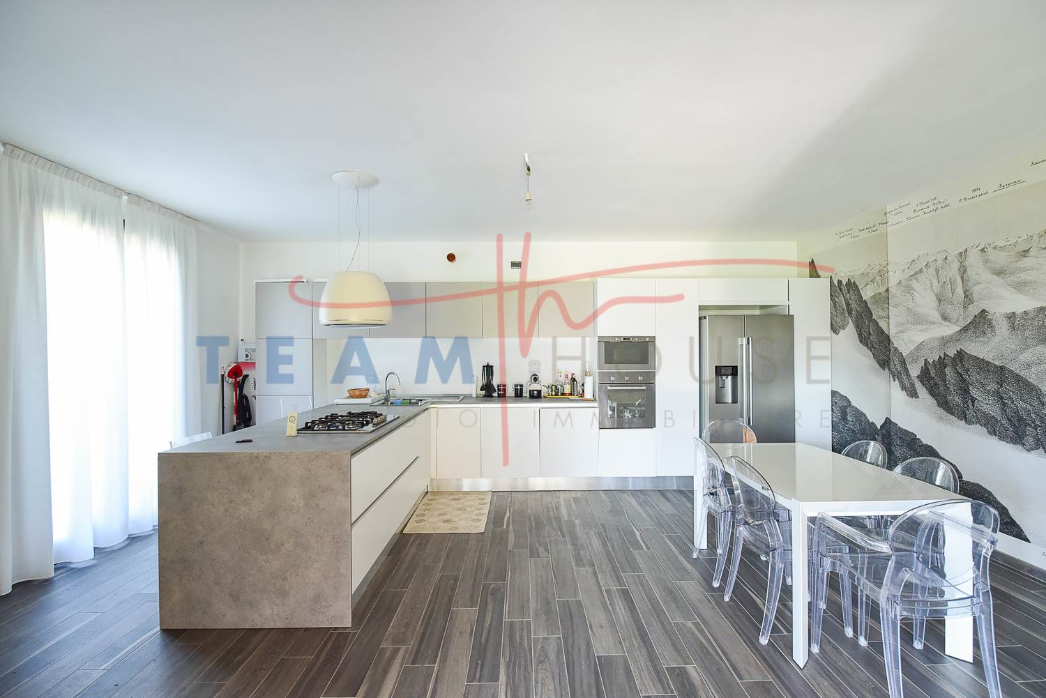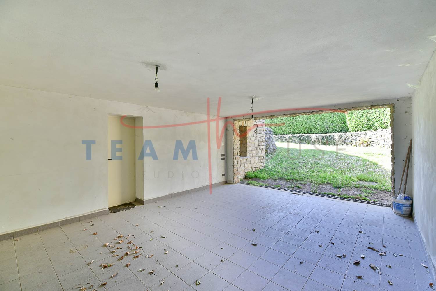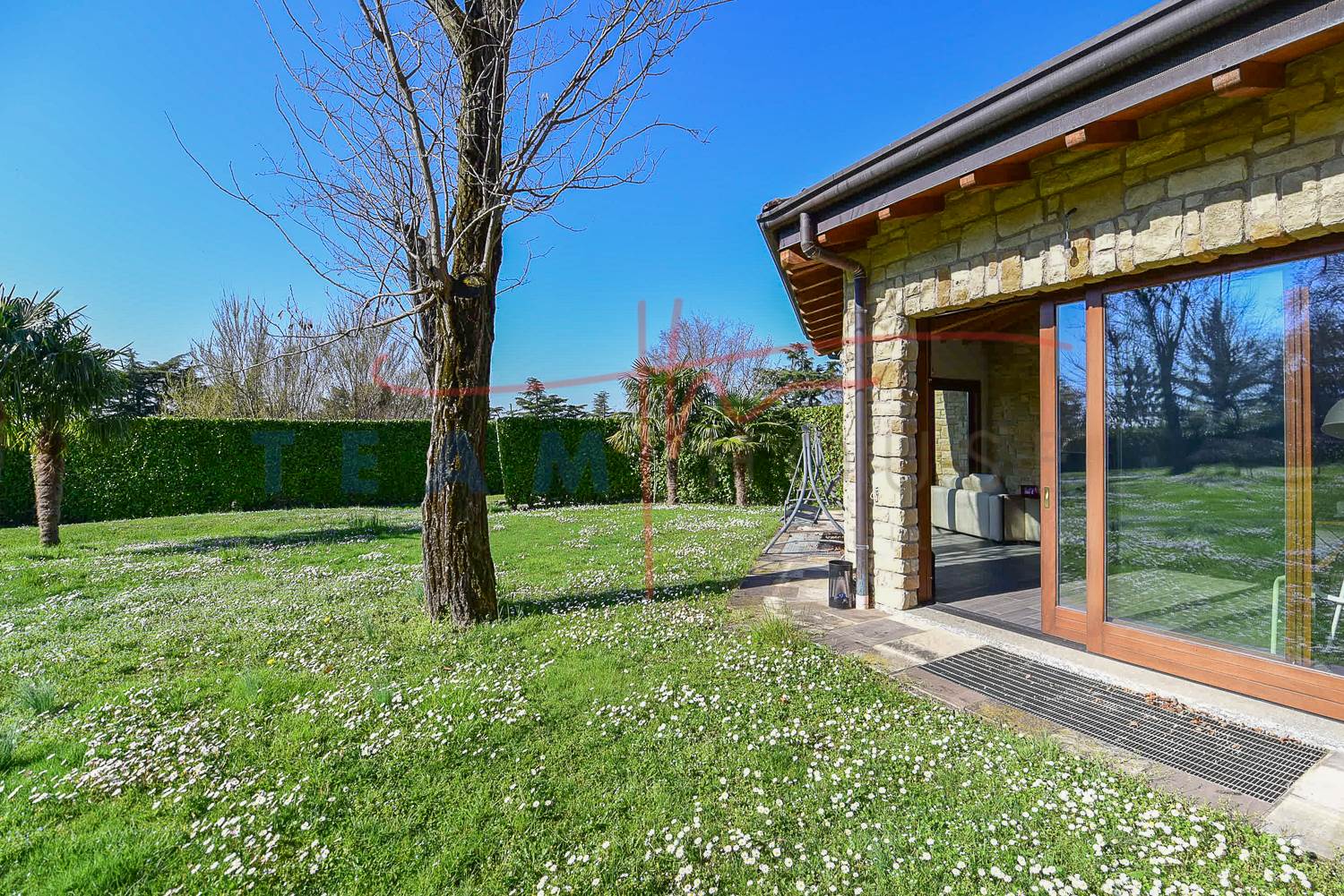 Zona Giorno: Grandi vetrate scorrevoli collegano direttamente il salone al giardino, abbattendo i confini tra interno ed esterno e garantendo una luminosità naturale straordinaria.
